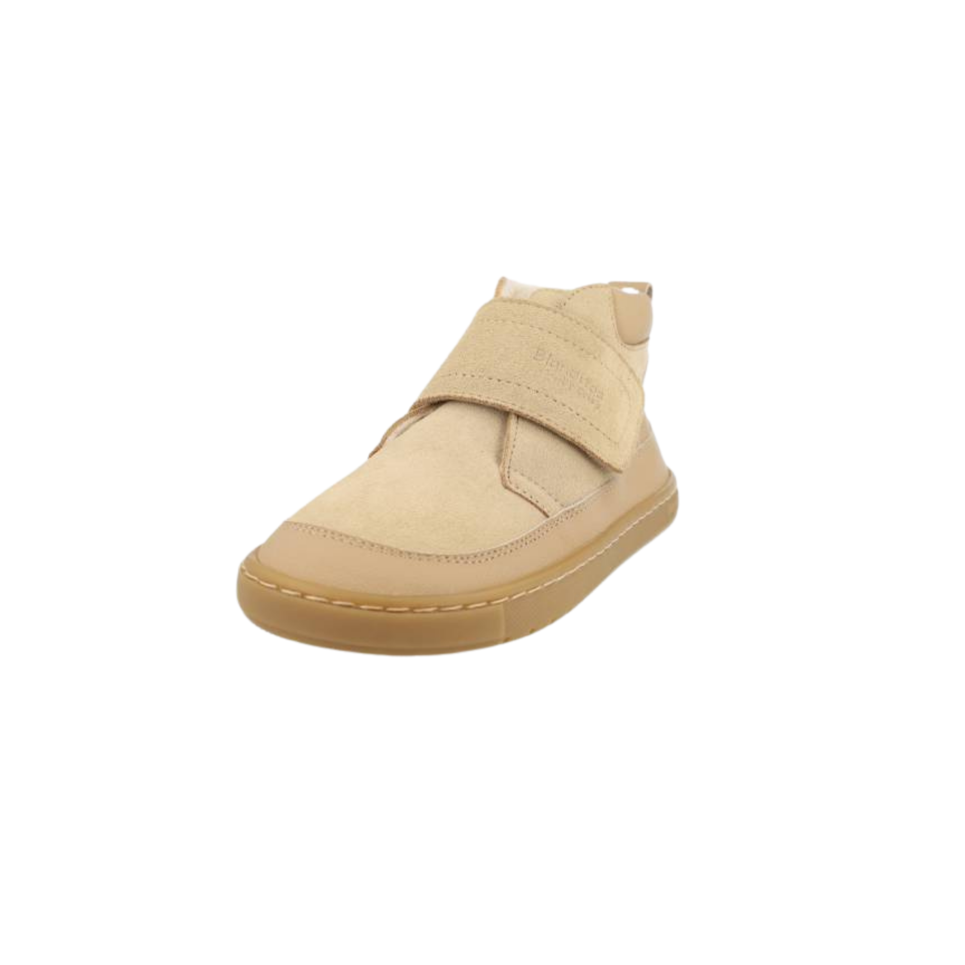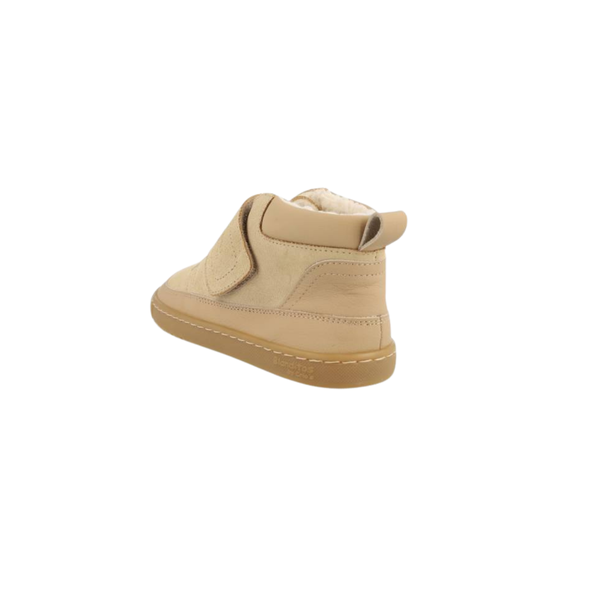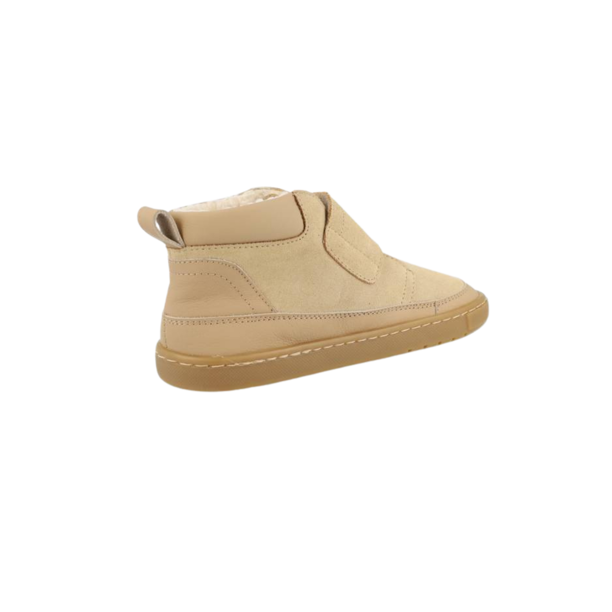 Botín en color arena, fabricado en piel y serraje, con forro de borreguito sintético y suela de caucho. Con cierre de velcro ancho. Suela antideslizante