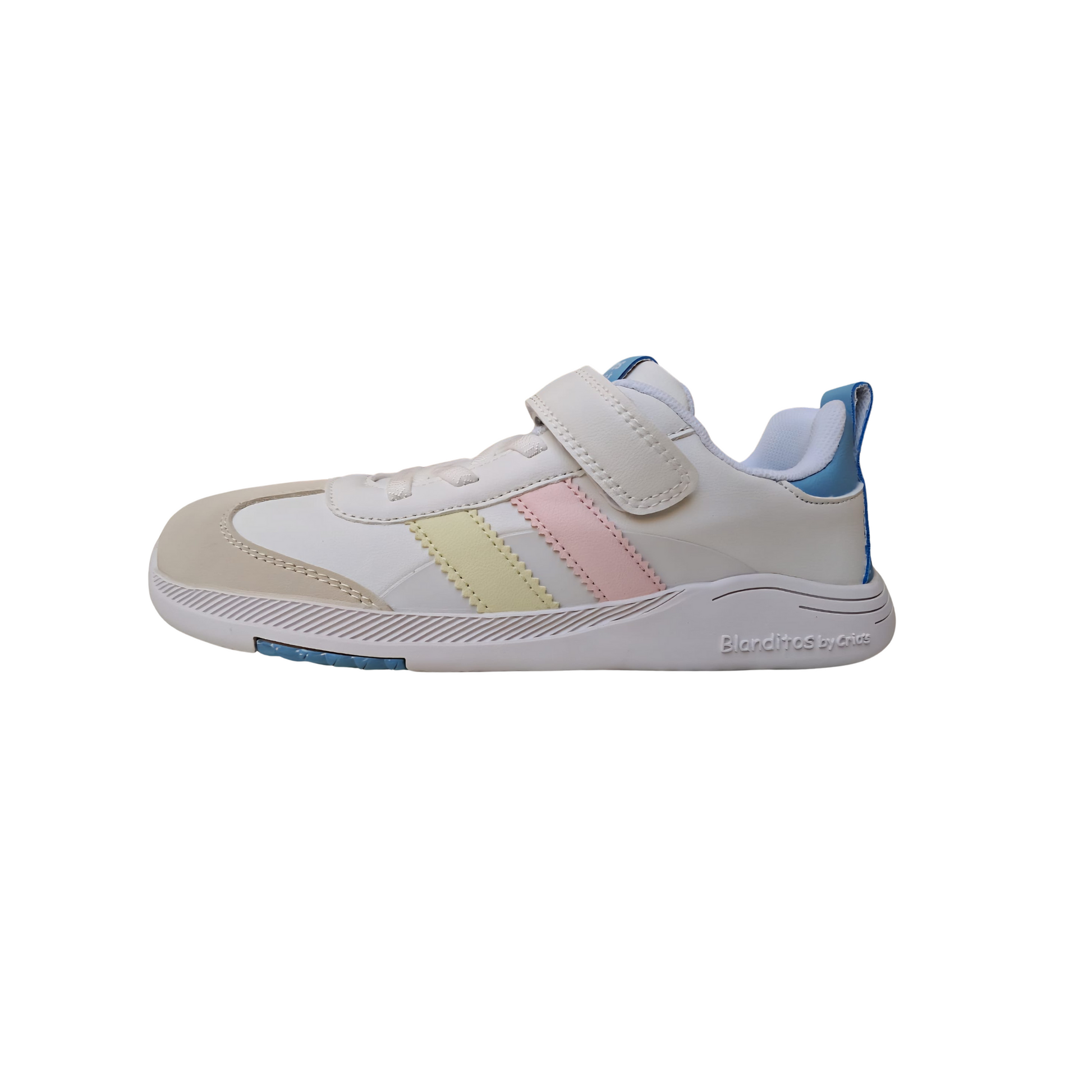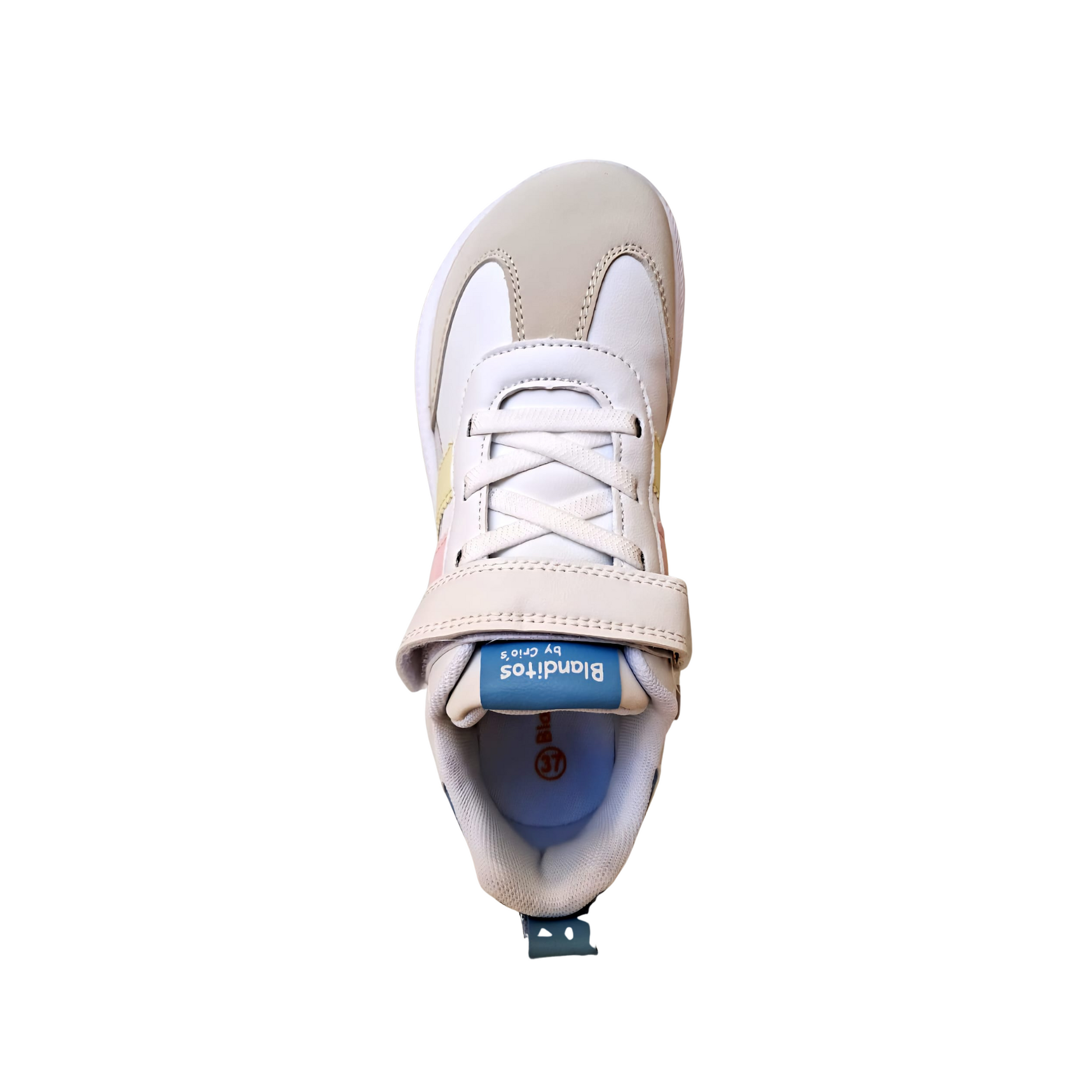 Deportivo Blanditos. Modelo Ares. Color blanco con detalles en amarillo, azul, beige y rosa. Realizado en microfibra y suela de goma antideslizante, de 5 mm. Cierre con velcro. Cordones decorativos.