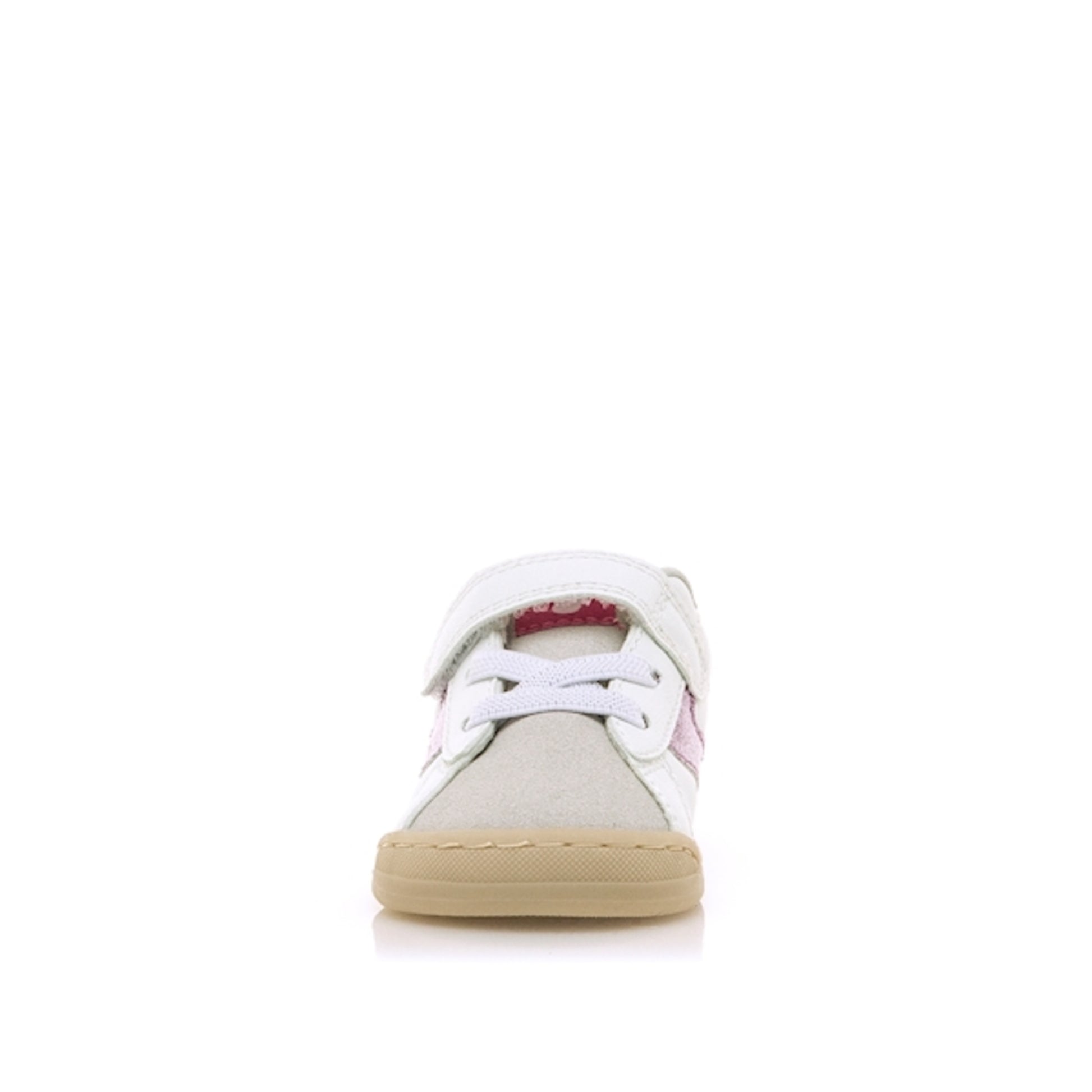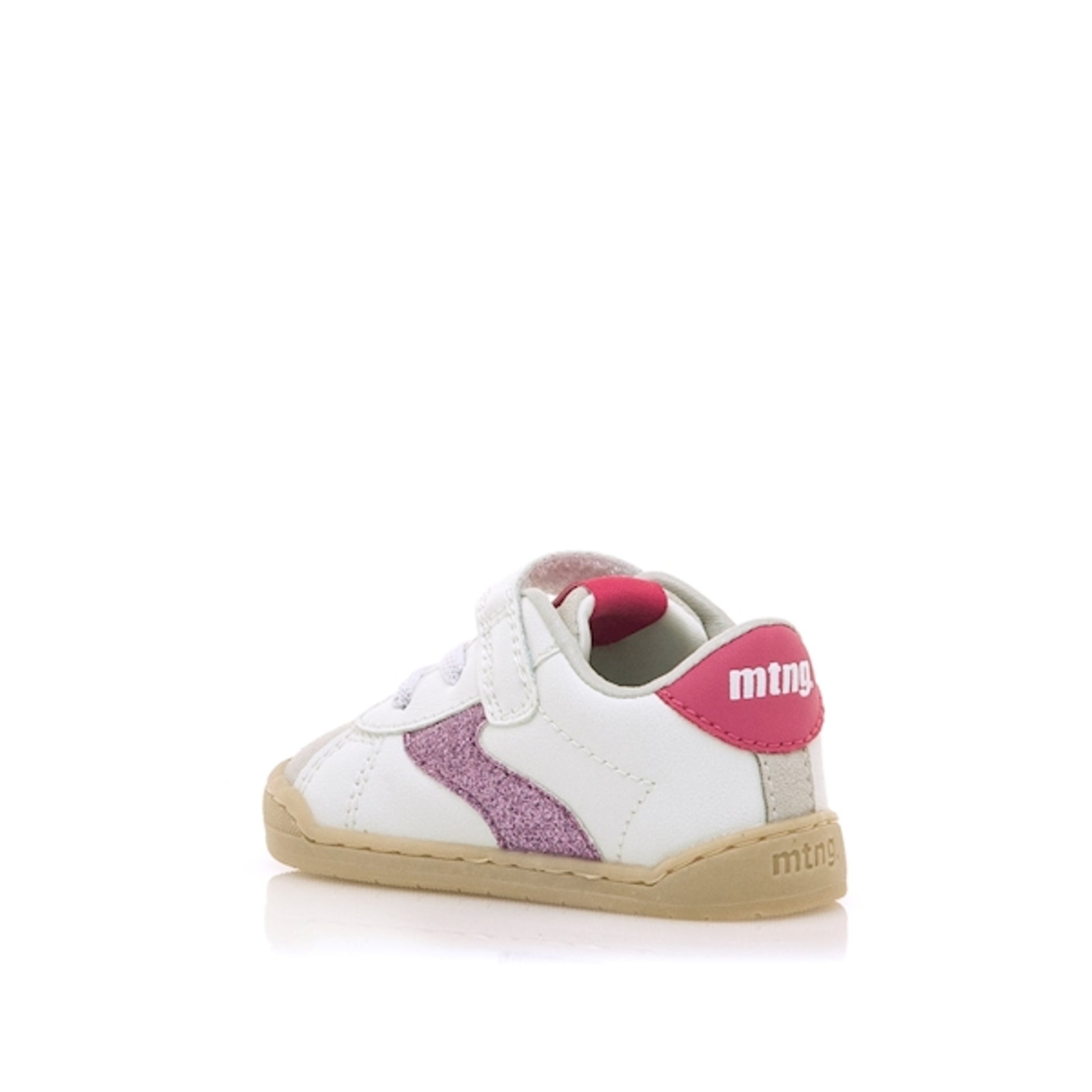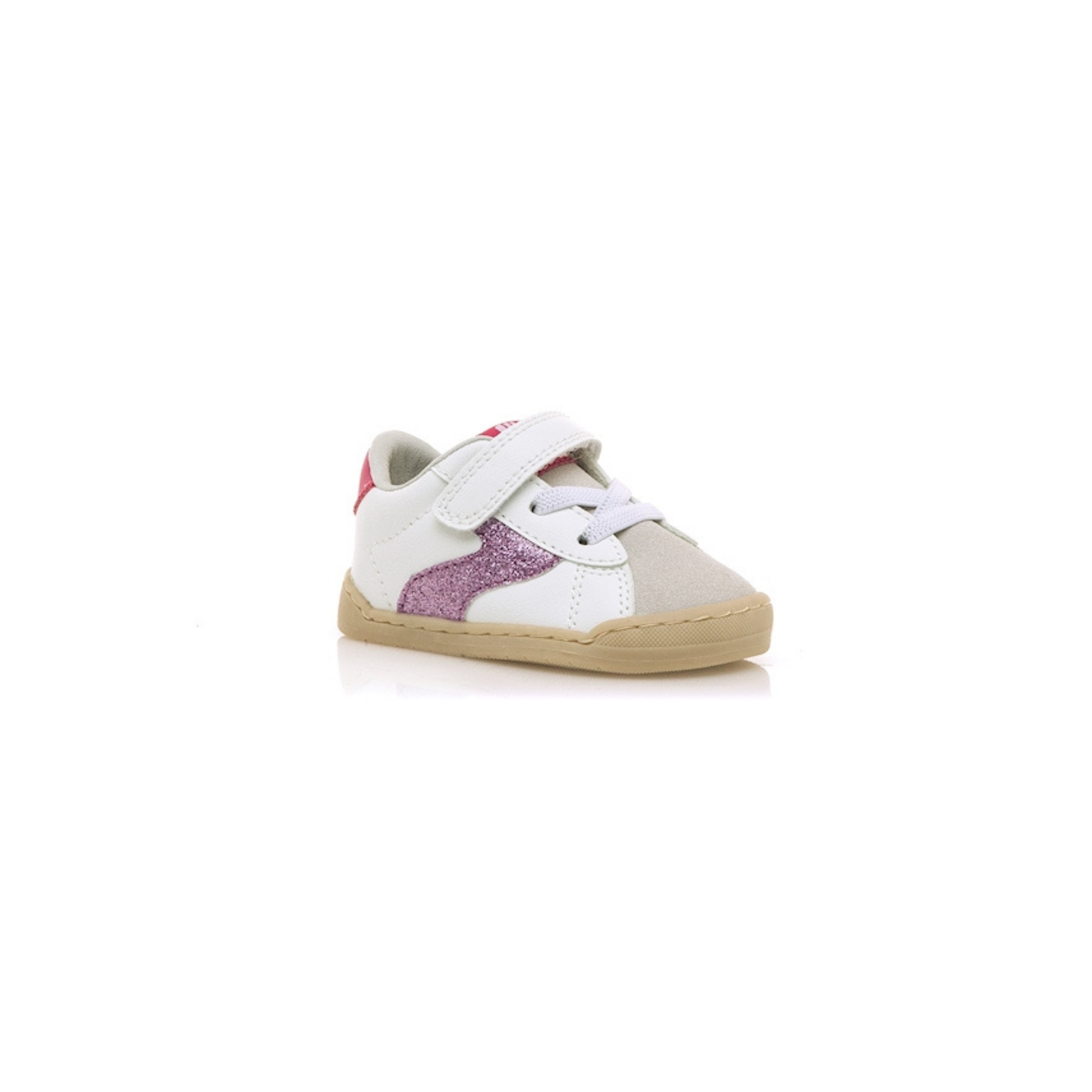 Zapatillas de color blanco Mustang, modelo Free Baby. Con detalles en glitter fucsia, talón y lengüeta rosa, y puntera gris.
