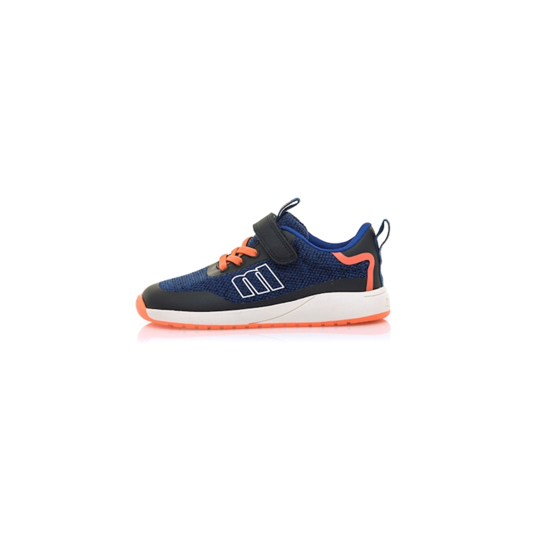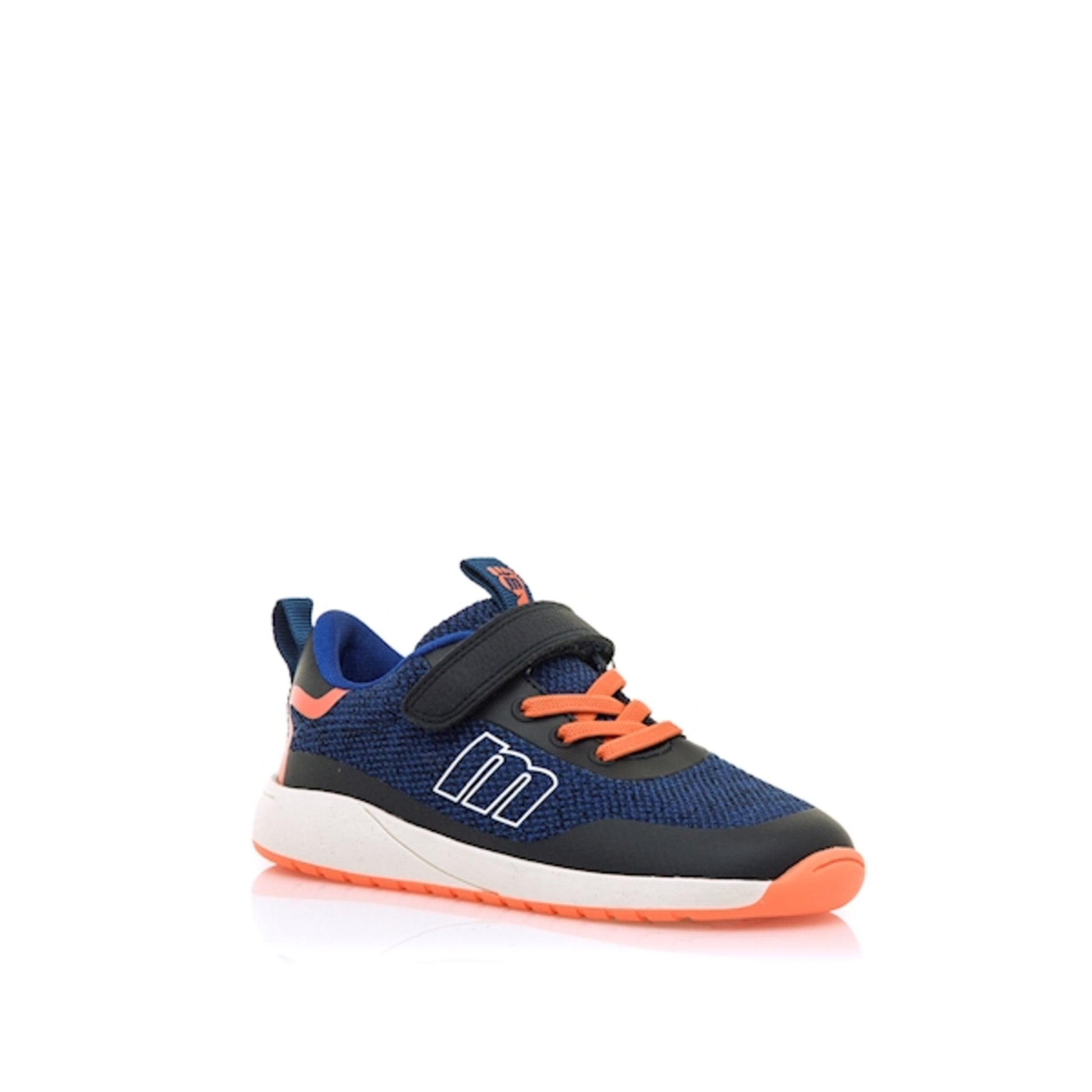 Zapatilla deportiva de color marino Mustang, modelo Free. Su diseño combina textura tejida con refuerzos en contraste negro y detalles en naranja neón. Incorpora cierre con cordones elásticos y tira adherente, lo que facilita un ajuste cómodo y rápido.
